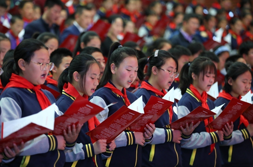 活动现场,田学军领读宪法部分条款,现场学生及全体人员跟读,各地学校通过网络直播同步跟读,深刻体会宪法的权威。随后,现场师生共同唱响《宪法伴我们成长》这首歌,感受宪法的力量。