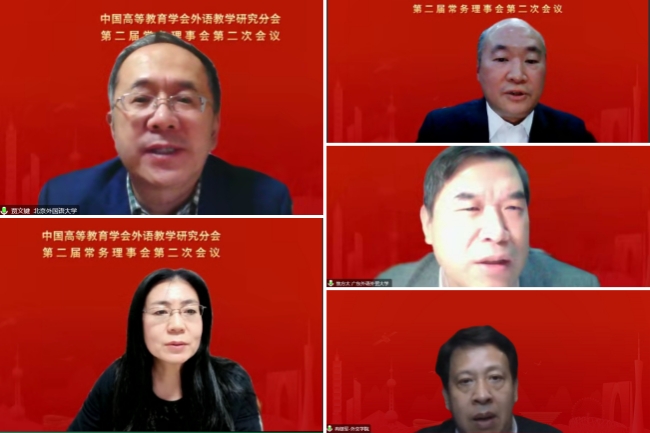 12月22日,中国高等教育学会外语教学研究分会(以下简称“分会”)第二届常务理事会第二次会议在线举行。分会常务理事会成员75人出席会议,分会监事修刚、副理事长、常务理事以及分会秘书处相关人员列席会议,分会副理事长、国际关系学院院长陶坚主持会议。