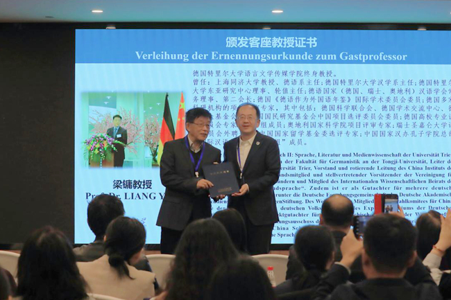 随后举行客座教授聘任仪式。德国特里尔大学语言文学学院终身教授、原特里尔大学汉学系主任、德语国家汉语学会第二会长梁镛受聘担任北京外国语大学客座教授,贾文键为其颁发客座教授聘书。