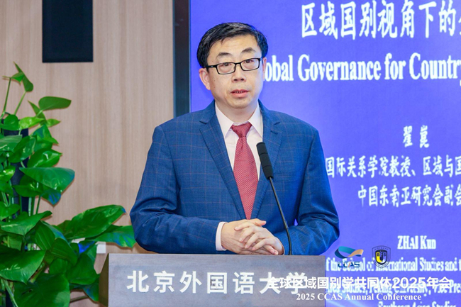 翟崑作题为“区域国别视角下的全球治理”的主旨发言。他强调,中国区域国别学以具体国家与区域的综合战略性研究为基石,遵循“学科、人才、智库”三位一体建设发展路径,旨在培养复合型人才,为全球治理提供关键人才支撑。