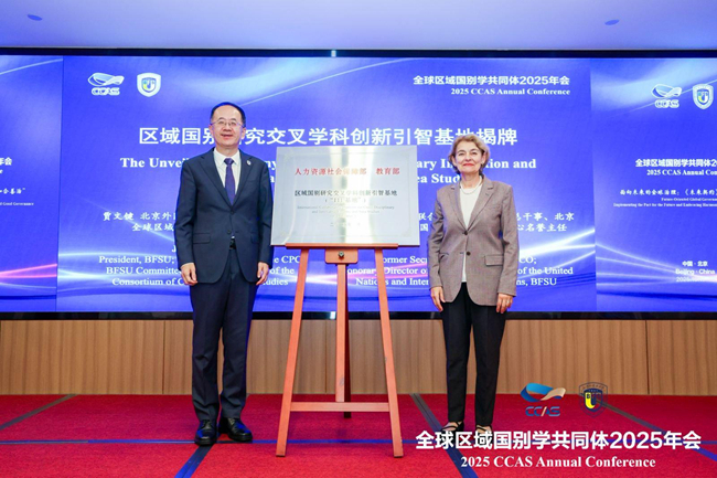 贾文键、伊琳娜·博科娃共同为“区域国别研究交叉学科创新引智基地”揭牌,《大学实施〈未来契约〉行动计划》、BFSU-SOAS关于区域国别学的联合倡议、“和合善治”青年学者网络倡议三项共同体建设成果在年会主旨论坛上发布。