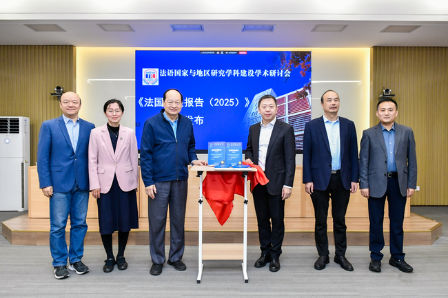 会上,北外法语学院及教育部备案法国研究中心、区域与全球治理高等研究院,中国欧洲学会法国研究分会联合发布了《法国发展报告(2025)》蓝皮书。刘欣路、丁一凡、南京大学教授刘成富、戴冬梅、张金岭和北外法语学院副院长王鲲共同为《法国发展报告(2025)》揭幕。