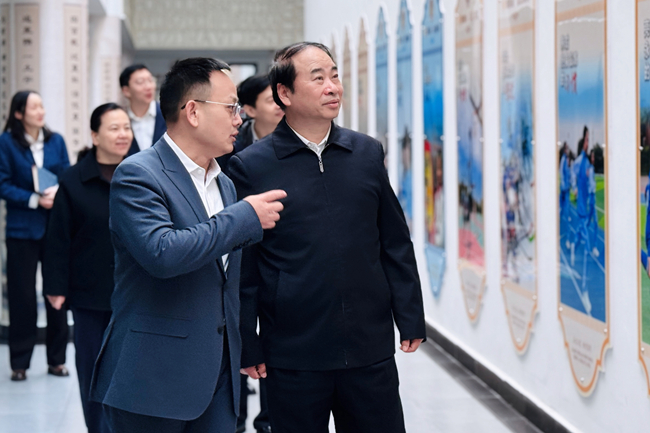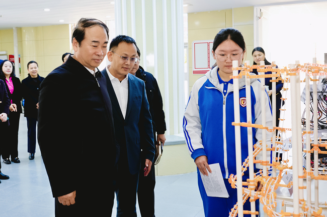 王定华先后参观了在小学部举办的“国风非遗,稚手匠心”主题艺术作品展,走进小学音乐课堂,聆听师生们正在排练的合唱曲目。在操场与明德广场,观摩了小学生“阳光跑”与大课间活动,感受同学们在运动中展现的青春活力。在主教学楼,王定华参观了中学跨学科教学成果展与复语教育展示,对同学们的语言表达能力、跨文化理解力以及项目设计中体现的综合素养给予高度评价。