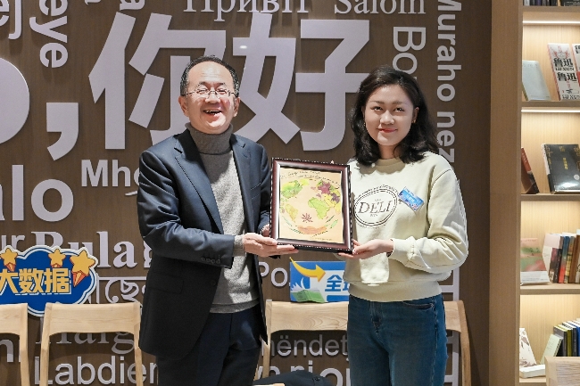 活动尾声,德语学院德语+大数据管理与应用专业2025级新生马睿怡作为学生代表,向贾文键赠送了由同学们亲手制作的树叶剪贴画。作品以拼贴成“世界地图”造型的树叶象征北外校园文化与世界多元文明,传递北外学子参与全球治理的青春理想。贾文键向同学们回赠精选书籍,寄望大家“以书为舟,以学为桨,航向更广阔的世界舞台”。