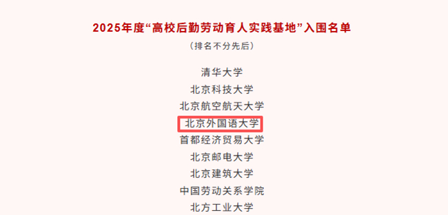 近日,中国教育后勤协会公布了2025年度“高校后勤劳动育人实践基地”入围名单。在此次遴选活动中,北京外国语大学积极参与,历经多轮严格选拔与评审论证,获评2025年度“高校后勤劳动育人实践基地”。