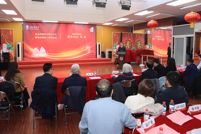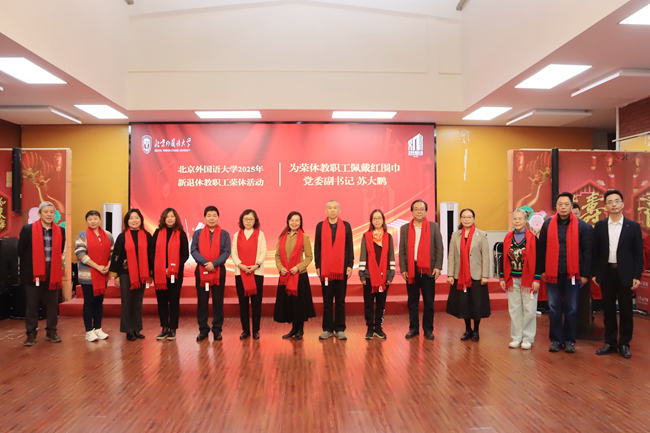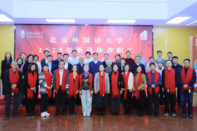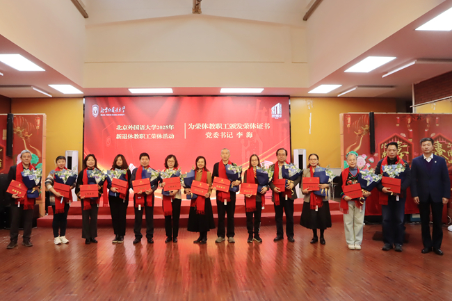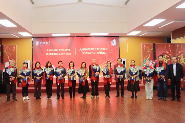 11月28日,北京外国语大学2025年新退休教职工荣休活动在西校区教职工活动中心举行。北外党委书记李海,党委副书记贾德忠、苏大鹏,原党委书记、校长陈乃芳,原党委书记杨学义,原党委副书记裴玉芳出席活动。活动由离退休人员党总支书记刘刚主持。