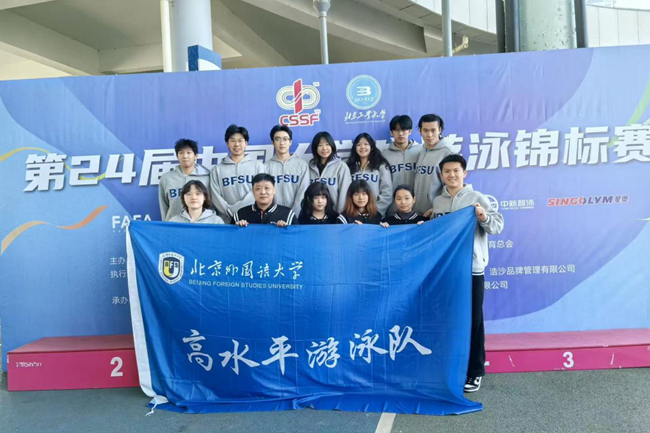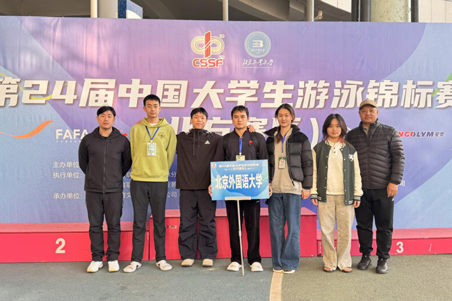 12月6日至10日,第24届中国大学生游泳锦标赛(北方赛区)在安徽滁州举行。北京外国语大学高水平游泳队与普通学生游泳队奋勇拼搏,在比赛中取得优异成绩。高水平游泳队在主教练林轶的带领下,共获1金3银2铜,丙A组团体总分第三名及丙A女子团体第三名。普通学生游泳队在体育教研部教师王新利、甄岢鑫的带领下同样表现出色,西班牙语葡萄牙语学院张淦雄获男子甲组200米仰泳第五名,国际关系学院谢雅琳获女子甲组100米蝶泳第八名。北外荣获“体育道德风尚奖”。
