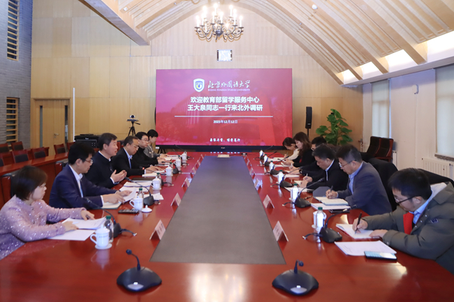 12月12日,教育部(中国)留学服务中心(以下简称“中心”)党委书记、主任王大泉,副主任夏建辉一行到北京外国语大学调研交流。北外党委书记李海主持座谈会,党委副书记贾德忠,党委常委、副校长赵刚出席会议。