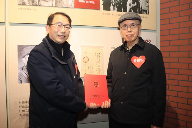 活动上,丁浩为曾建实颁发捐赠证书,就其对北外档案与校史保存工作的大力支持表示感谢。11月5日,曾建实将1942年中央军委任命曾涌泉为军委俄文学校校长的珍贵任命书原件捐赠给了学校。