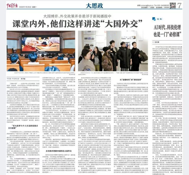 1月26日,《中国青年报》以《课堂内外,他们这样讲述“大国外交”》为题报道北外思政课育人成效。马克思主义学院副院长王曼倩、形势与政策教研室主任李建嵘和2023级国际关系学院本科生朱怡璇接受了专题采访,介绍了北外思政课指导学生将宏大叙事与个人生活连接,在实践中理解中国特色大国外交,从读懂时代到讲好中国故事的建设实践和育人成效。