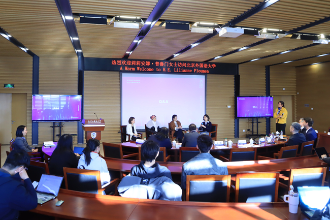 会见后,普鲁门围绕“女性赋能”主题为北外师生开展讲座与对话,分享她在个人成长及促进女性发展领域的宝贵经验与深刻见解,鼓励年轻女性坚定信心、鼓足勇气,把握自己的未来。赵刚为讲座致欢迎辞,介绍北外杰出的女性校友及教授,以及北外秉持兼容并蓄、博学笃行的精神,为推动青年成长、加强沟通和理解所作的努力。胡克斯特拉在致辞中高度肯定北外在荷兰语人才培养方面的卓越贡献。