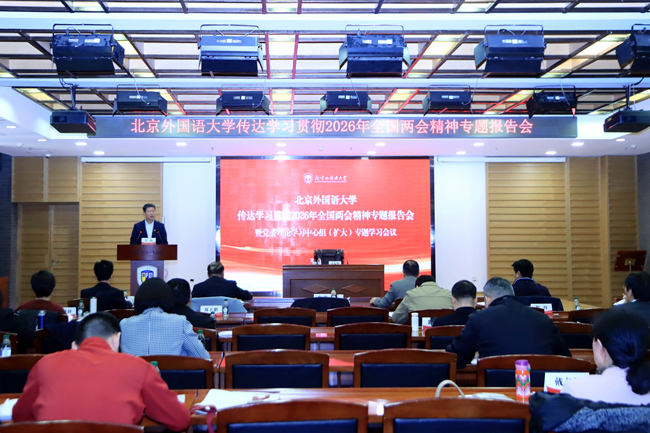 3月20日,北京外国语大学举行传达学习贯彻2026年全国两会精神专题报告会暨党委理论学习中心组(扩大)会议。党委书记、党委理论学习中心组组长李海主持会议,并就学校深入贯彻落实全国两会精神进行部署。第十四届全国政协委员、北外教育学院教授王定华受邀分享参会履职、建言献策的经历与体会。党委副书记、校长贾文键,党委副书记苏大鹏,党委常委、副校长赵刚、刘欣路,党委副书记、纪委书记尹兆华,校长助理李轶群参加会议。