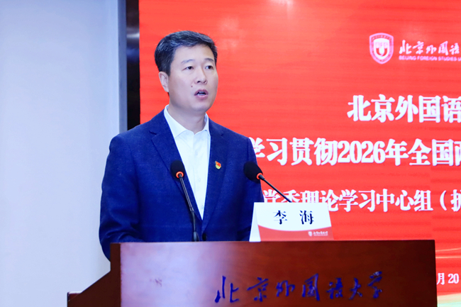 李海指出,2026年全国两会是在“十四五”圆满收官、“十五五”开局起步之际召开的一次重要会议。我们必须切实将两会精神转化为攻坚克难、干事创业的“真本领”和“强引擎”,抢抓机遇、直面挑战,守正创新、积极作为,科学谋划未来发展蓝图,扎实推动学校事业发展,深入推进外语教育变革,主动服务国家战略大局,努力开创中国特色、世界一流外国语大学崭新局面。一要把牢方向,确保党的领导贯彻始终。坚持不懈以习近平新时代中国特色社会主义思想为指导,强化党的创新理论武装,扎实开展树立和践行正确政绩观学习教育,营造风清气正的办学治校良好生态。二要抓好根本,塑造立德树人崭新格局。实施新时代立德树人工程,探索适应时代特点与科技水平的外语拔尖人才自主培养模式,培养更多有家国情怀、有全球视野、有专业本领的高素质复合型人才。三要扛起使命,提升服务国家战略能力。向服务国家使命转变,打造“顶尖外语、卓越人文、一流社科、工科赋能、交叉融合”的学科发展格局,建设以标识性概念、原创性理论为主干的北外特色学科自主知识体系,为国家参与全球治理、深化文明交流互鉴、构建人类命运共同体作出新的更大贡献。四要建强队伍,形成世界一流人才高地。大力弘扬教育家精神,坚持“引育留用”并举,多举措强化教师队伍建设,创新人才发展机制,开展分级分类考核,激发教职员工干事创业内生动力。五要擦亮名片,拓展全球教育交流合作。服务教育对外开放战略,统筹“引进来”和“走出去”,推进北外全球战略六大行动计划(“CREATE”)2.0落地落实,讲好中国故事、北外故事。六要夯实地基,建设智慧平安健康校园。建成“泛在互联、数据驱动、AI赋能、安全可信”的北外智慧体系,构建“党委领导、部门负责、单位配合、师生参与、法治保障、科技支撑”的校园安全治理态势,践行“健康第一”的教育理念。
