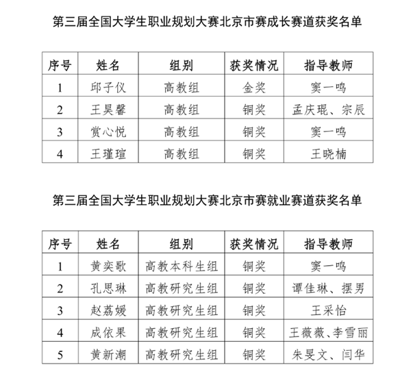近日,第三届全国大学生职业规划大赛北京市赛总决赛举行,北京外国语大学9名学生获奖。赛事分成长赛道和就业赛道开展,在成长赛道中,亚洲学院邱子仪获金奖,英语学院王昊馨、王瑾瑄和亚洲学院赏心悦获铜奖;在就业赛道中,亚洲学院黄奕歌、国际商学院孔思琳、英语学院赵荔媛、高级翻译学院成依果和中国语言文学学院黄新潮5名学生获铜奖。
