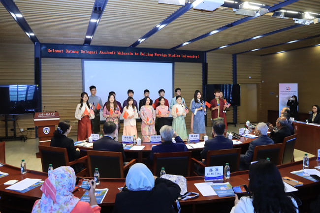 贾文键向代表团赠送以祝福中马友谊长存为主题的学生画作《彩路通万邦,丹香牵南洋》。代表团一行参观了北外校史馆和亚洲学院马来研究中心,了解了学校发展情况及马来语专业建设成果。会见前,北外马来语专业学生带来合唱《一起跨越山海》(Dua Dunia Satu Cinta)。