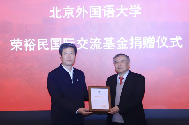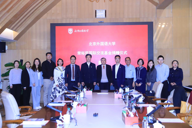 4月23日,“北京外国语大学荣裕民国际交流基金”捐赠仪式举行。北外党委书记李海、党委副书记苏大鹏,德语学院1977级校友、德国Rolux Leuchten GmbH公司创始人、中国赛尔富电子有限公司董事会成员荣裕民出席仪式。