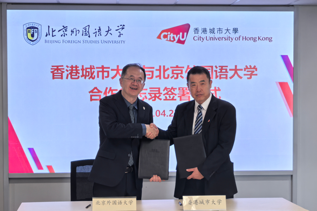 4月22日下午,北外代表团访问了香港城市大学。贾文键与香港城市大学副校长、港城大(东莞)执行校长鲁春,港城大协理副校长吴振富,人文社会科学院院长何达基,法律学院院长林峰等举行会谈,并签署两校合作备忘录。会谈中,贾文键介绍了北外的办学特色、学科专业、全球战略规划以及在中外合作办学、涉外法治、区域国别研究等领域的最新进展,期待在现有合作框架下,立足北外国际化办学特色,进一步拓展师生互访、联合科研和人才培养等领域的合作,重点推动比较法学、国际事务、媒体与传播、语言文学等学科的深度对接。鲁春对北外代表团到访表示欢迎,介绍了香港城市大学及其东莞校区近年来在学科建设、国际化发展等方面取得的进展,并表示期待以此次签署合作备忘录为契机,深化两校务实合作,共同培养具有全球视野的高素质人才。