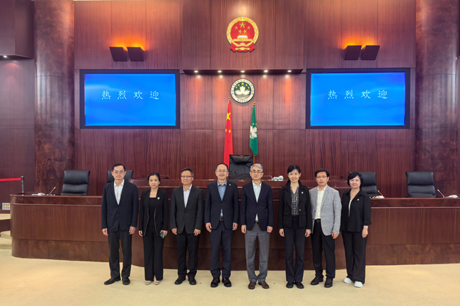 当天傍晚,代表团一行拜会澳门特别行政区立法会,立法会主席、北外85级校友张永春会见贾文键一行。双方围绕 “一国两制”在澳门的成功实践、澳门立法程序及涉外法律体系建设展开深入交流。贾文键介绍了北外在涉外法治人才培养、比较法学研究领域的优势与成果,希望借助澳门法治实践平台,强化法学学科实践教学,提升学生国际法律实务能力。张永春对北外办学特色与人才培养成效给予高度评价,表达对北外涉外法治人才培养与法学研究工作的支持。