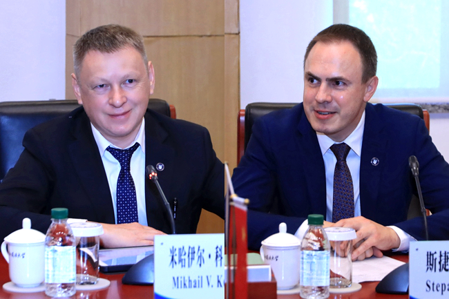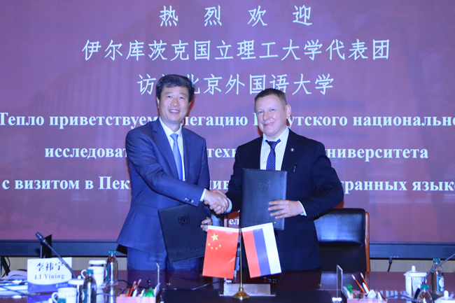 李海和米哈伊尔・科米亚科夫代表两校签署合作备忘录与学生交换协议。会后,伊尔库茨克国立理工大学代表团参观了北外校史馆、世界语言博物馆,充分肯定了北外的办学传统与卓越成绩。
