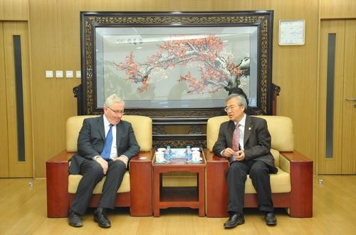 11-0511月5日下午,英国雷丁大学校长大卫贝尔访问我校。校长韩震会见了贝尔一行,双方就加强交流合作进行了会谈。 (记者 郭玮)